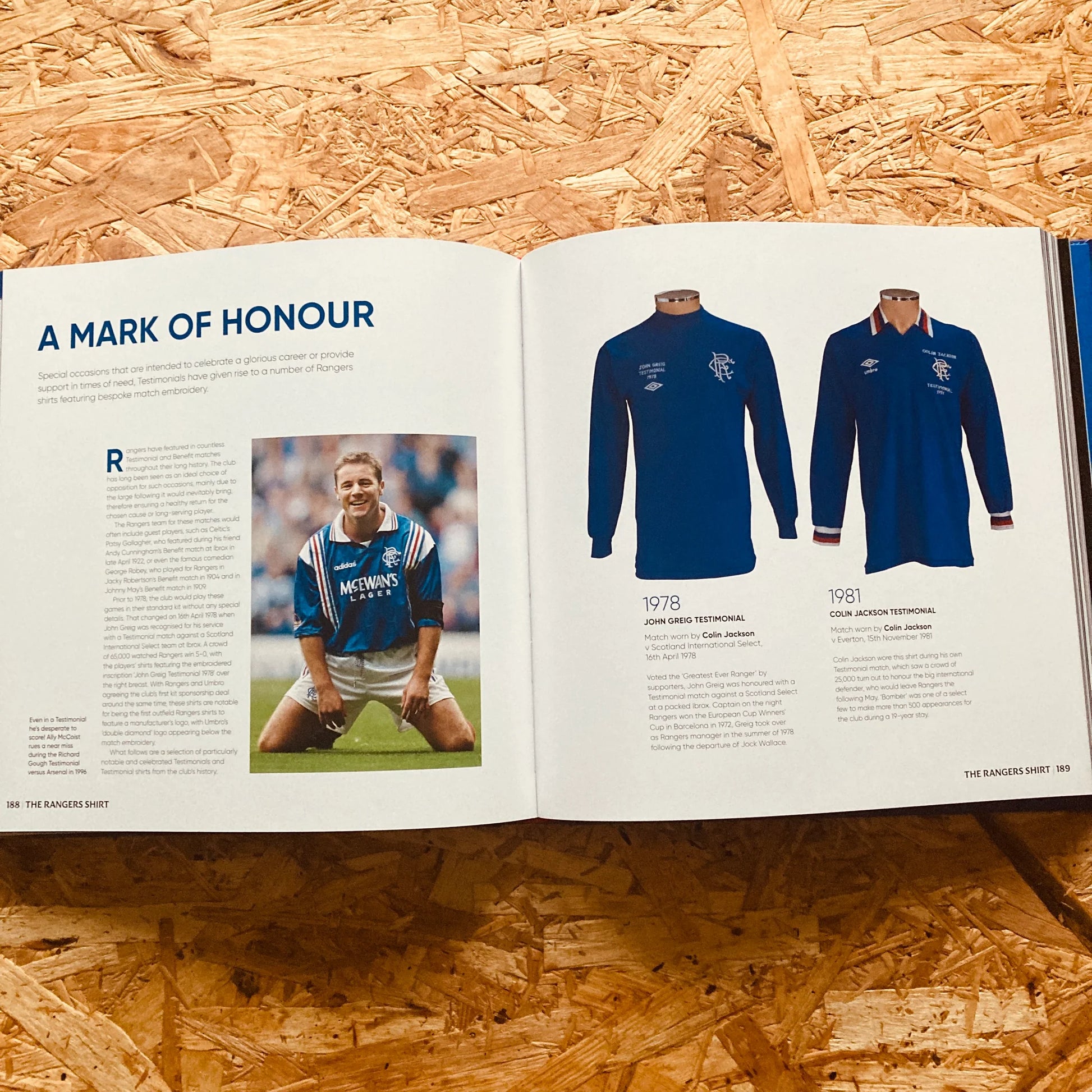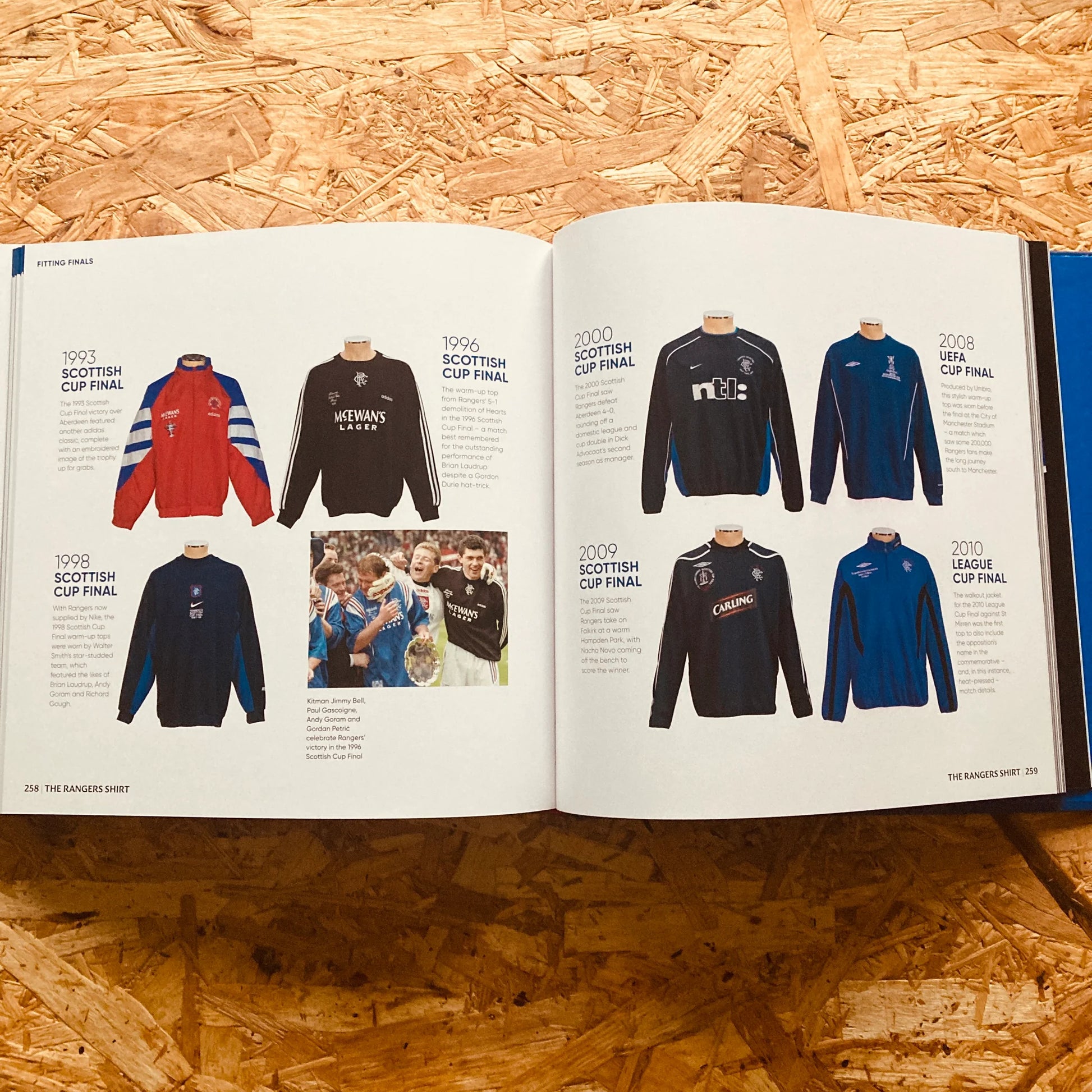 It includes shirts worn by the club's most famous players, including; Derek Johnstone, Alan Morton, George Young, Paul Gascoigne, Davie Cooper, Ally McCoist, Andy Goram, Richard Gough, Barry Ferguson, Brian Laudrup and James Tavernier.